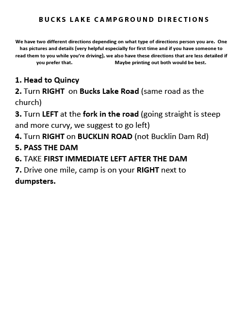- It is the responsibility of the parents to get each boy to and from camp. Because Bucks Lake is so far away, we suggest you carpool with other parents. Drop off for all Young Men is Thursday, August 6th at 11:00 am.