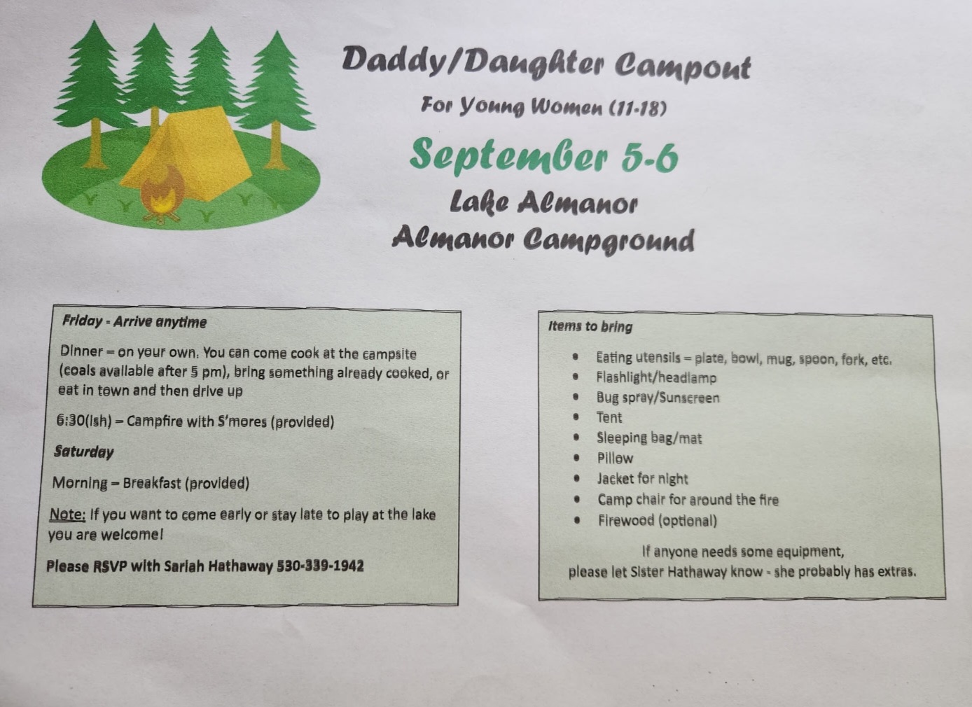 The Susanville Ward will be hosting a Stake Daddy & Daughter Campout this summer! This campout is for Dads and their daughters that are currently in Young Women’s (11-18). Mark your calendars for September 5-6, 2025. Arrive Friday night anytime after 5:00pm. Bring your own dinner. Breakfast will be provided. Packing List and information below.