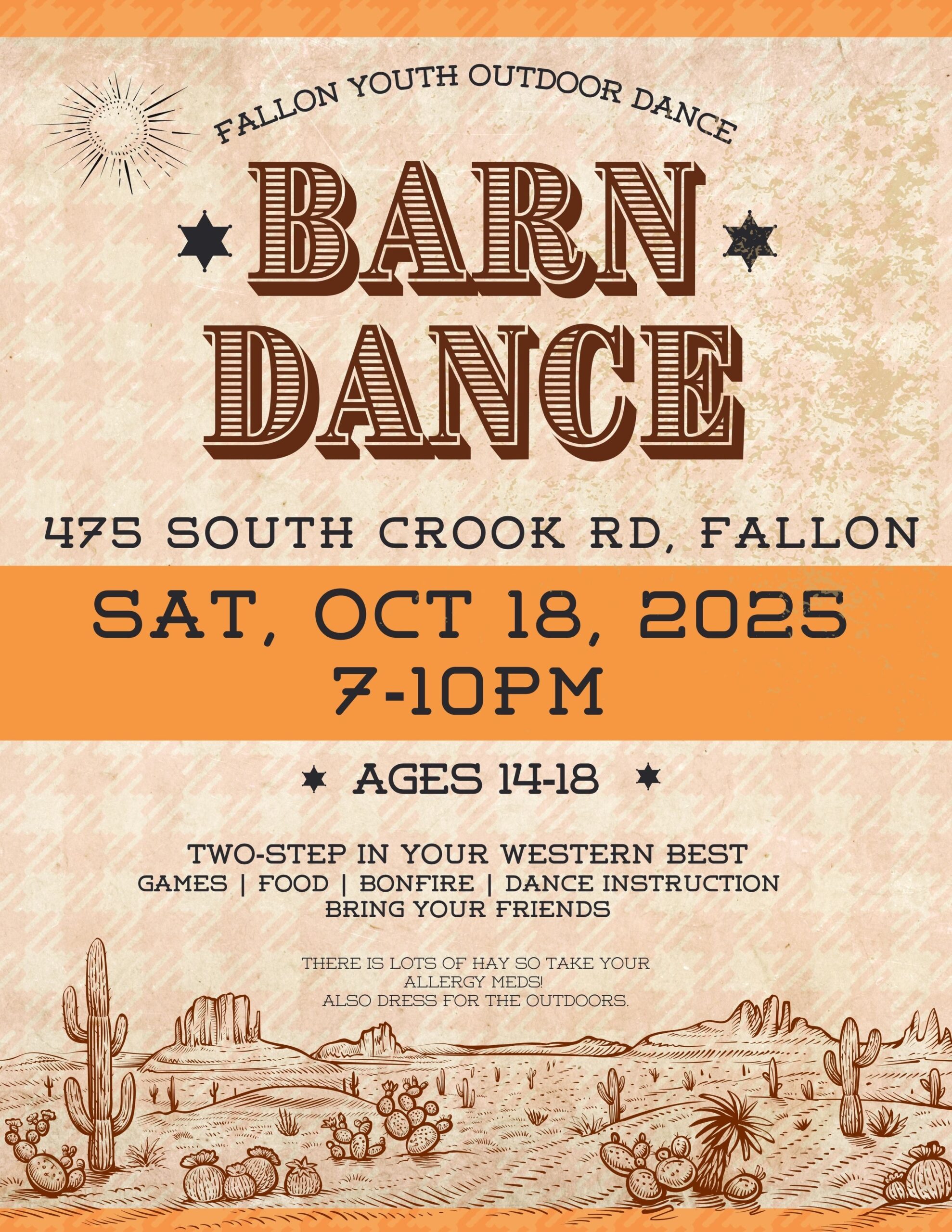 All youth turning 14-18 are invited to an Outdoor Barn Dance in Fallon, Nevada! Saturday, October 18th from 7-10pm. Two-Step in your western best. Games, Food, Bonfire & Dance Instruction. Bring your friends. There is a lot of hay so take your allergy meds and dress for the outdoors.